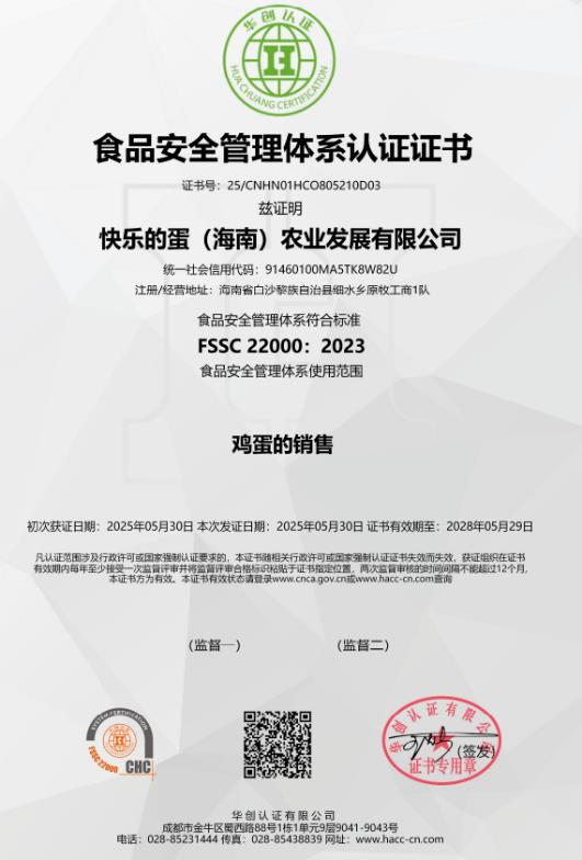 FSSC 22000 | 【农场】快乐的蛋细水农场 | 2022-03-17 | 2028-05-11(925天) | 查看 |